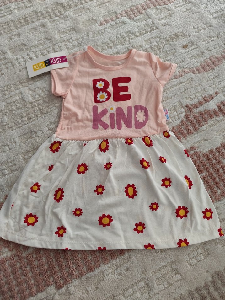 Renkli pamuklu kumaştan, kısa kollu, yuvarlak yakalı elbise etiketli 9-12 aylık