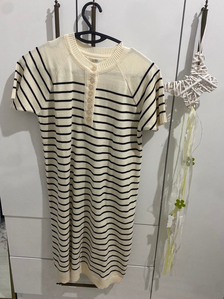 Kısa kollu, bisiklet yaka ve çizgili desene sahip, beyaz ve siyah renklerde triko, vücuda oturan midi elbise. Günlük kullanıma uygun