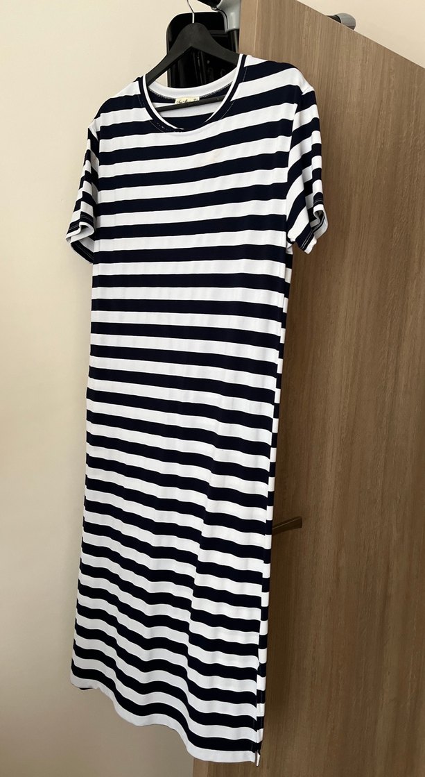 Pamuklu, kısa kollu, tekne yaka ve yan yırtmaçlı çizgili uzun elbise. Rahat hareket için yan yırtmaç bulunur. Günlük rahat sokak stili için uygundur.