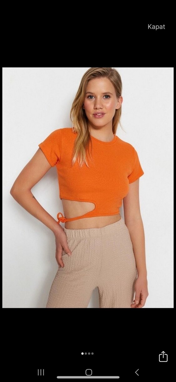 Canlı turuncu renkte, kısa kollu ve yan kesim detaylı, dar kesim crop top. Rahat sentetik kumaştan, sorunsuz bir kez giyildi