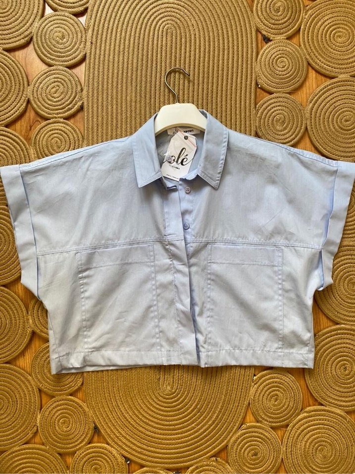 kısa kesim, düğmeli ve yakalı crop gömlek. Rahat kesimiyle günlük sokak stiline uygun, pastel mavi tonunda.