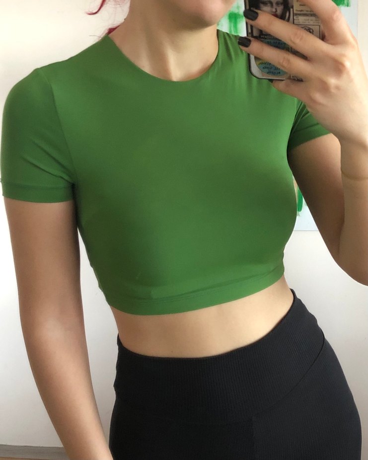 Koyu yeşil renkte, kısa kollu ve bisiklet yaka olan bu crop top, sentetik kumaştan yapılmıştır. Spor ve sokak stili için uygundur.