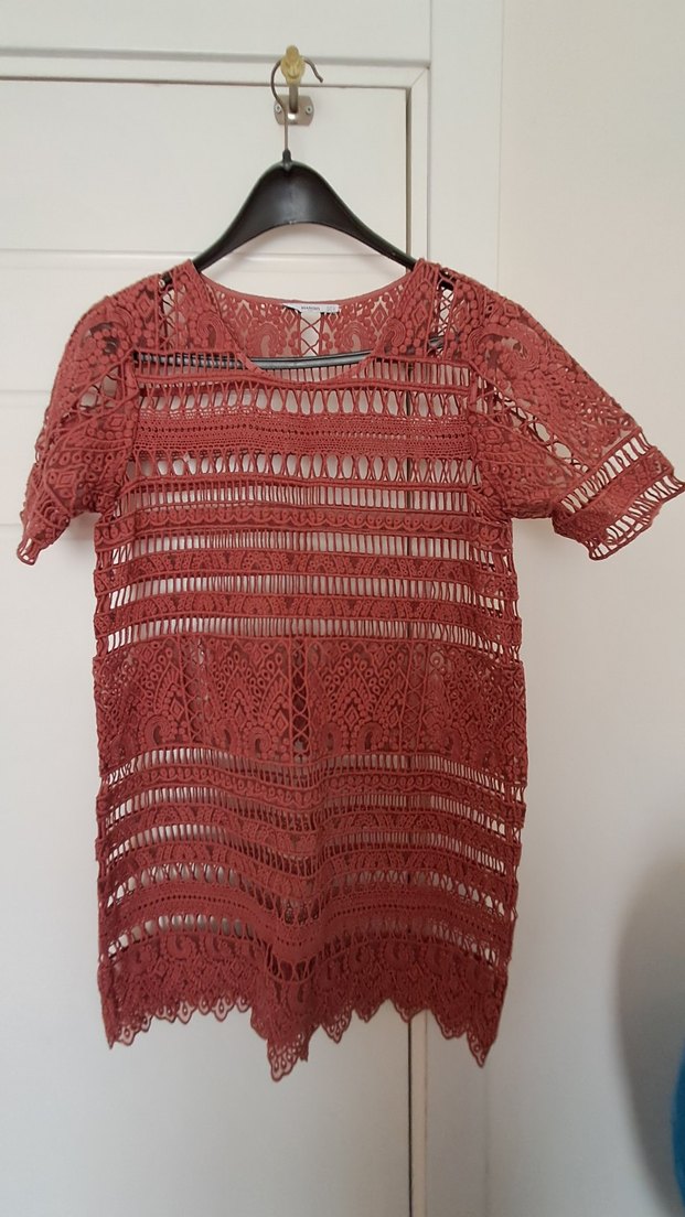 Tarçın renkte, dantel detaylı ve tekne yakalı kısa kollu, bol kesim bohem triko elbise. Dantel görünümüyle çok şık duruyor.İçinde kendi astarı vardır. Yaz geceleri için ideal bir yapısı var.Tok duran bir dokuma yapısı var. Hiçbir kusuru yok dar geliyor.