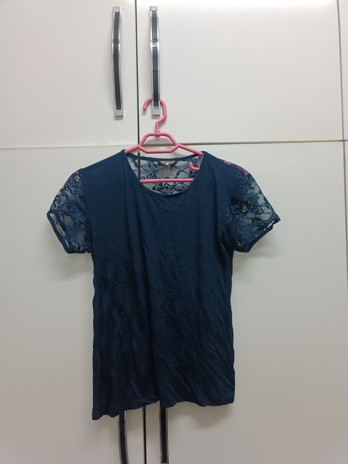 Kısa Kollu Dantelli Lacivert Kadın Bluz
