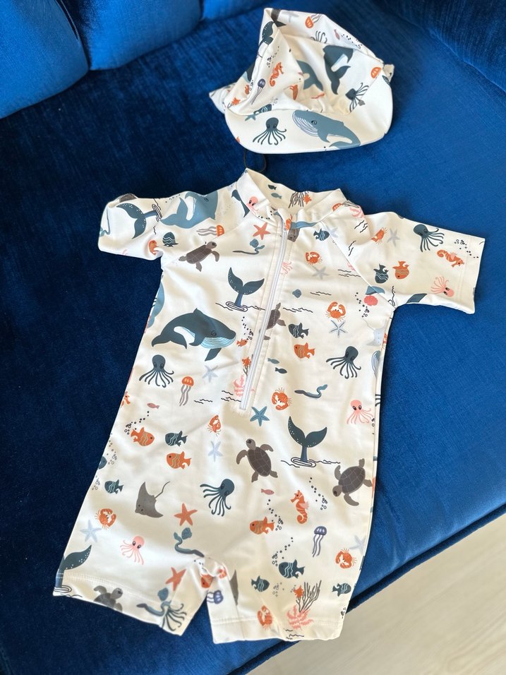 Kısa kollu, yüksek yakalı ve önden fermuarlı bebek mayosu. Yumuşak sentetik kumaştan, beyaz zemin üzerinde renkli deniz canlıları desenli. Şapka da dahil. Tatilimizi iptal ettik kullanamadı aşırı güzel bir mayo çok içimde kaldı 1 yaşa da olur.