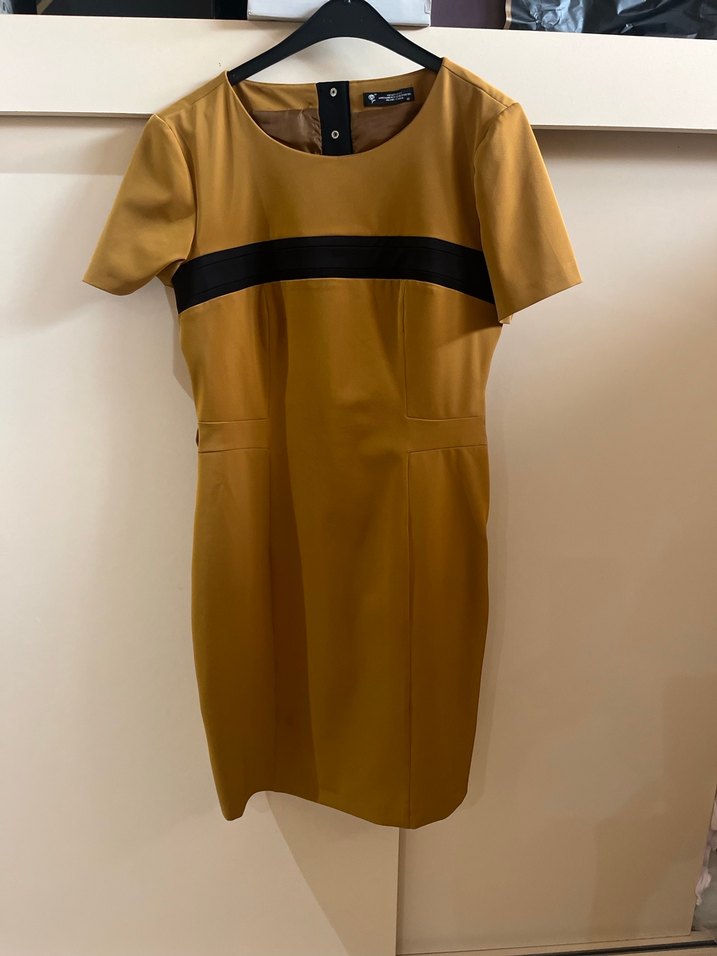 Bej renkli, kısa kollu, deri midi elbise, yuvarlak yakalı ve kemerli. Parlak dokusu ve normal kesimiyle ofis ve sokak stiline uygun. ✨