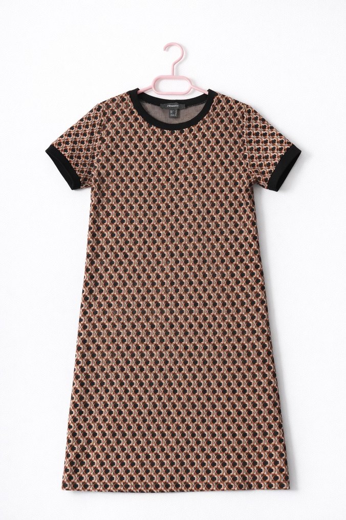 Kısa kollu, yuvarlak yakalı ve bol kesim olan bu kahverengi desenli midi elbise, Bir iki kez kullanıldı tertemiz