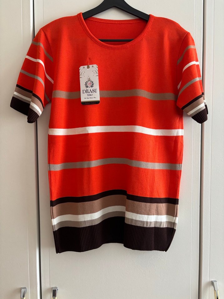 Kadınlar için kısa kollu, renkli çizgili desenli, bol kesim kısa triko tişört. Yuvarlak yakalı, günlük rahat kullanım için uygun.