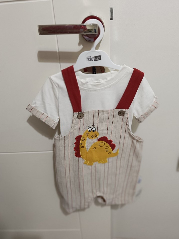 Kısa kollu, yuvarlak yaka bebek tulumu, renkli dinozor baskısı ve tokalı askılarla sokak stili sunar. Yumuşak tekstil malzemeden, kahverengi tonlarında.