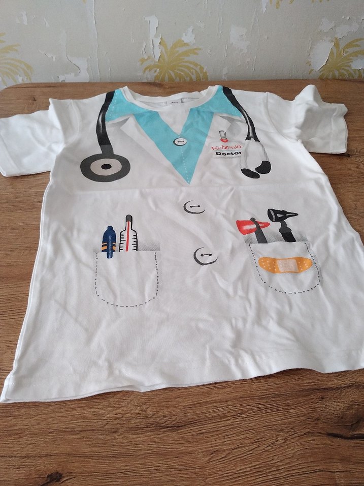 Kısa kollu, pamuklu ve renkli doktor temalı baskılı hastane kıyafeti temız kullanılmıştır