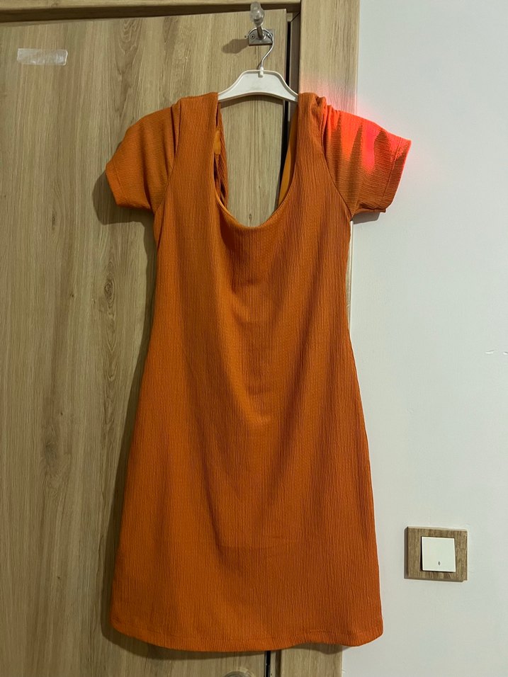 Kısa kollu, dökümlü tasarıma sahip, tek renk parlak turuncu midi elbise. Sokak stiline uygun şık kesim.