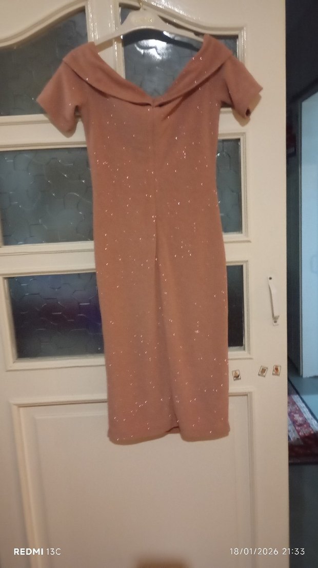 Fitted kesim, uzun gece elbisesi, tekne yaka ve drapeli tasarıma sahiptir. kısa kol ve simli detaylıdır, romantik akşamlar için uygundur.