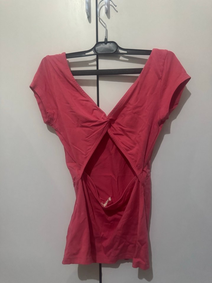 Koyu kırmızı renkte, kısa kollu ve V yaka, drapeli tasarıma sahip kadın tişörtü. Sentetik kumaştan, sokak stiline uygun ve dış mekan kullanımı için ideal.