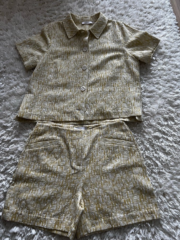Kısa kollu, düğmeli ve çentikli yakalı üst ile uyumlu şortlardan oluşan kadın takımı. Dokulu kumaştan, altın tonunda, rahat kesim ve samimi, sokak tarzı. Günlük kullanım için ideal, bohem ve retro havasında. ✨