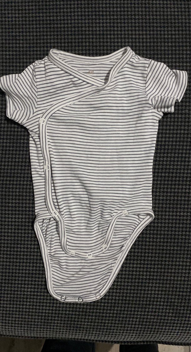 Kısa kollu, V yaka ve düğmeli bebek kız body. İnce gri ve beyaz çizgili deseniyle rahat ve kullanışlıdır.