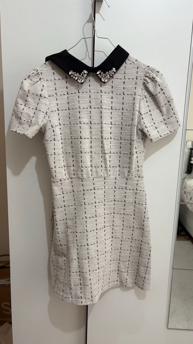 Kısa kollu, düğmeli, siyah yakalı bej kareli triko elbise. İnce kesimli ve midi boyda, gündelik sokak modasına uygun.
