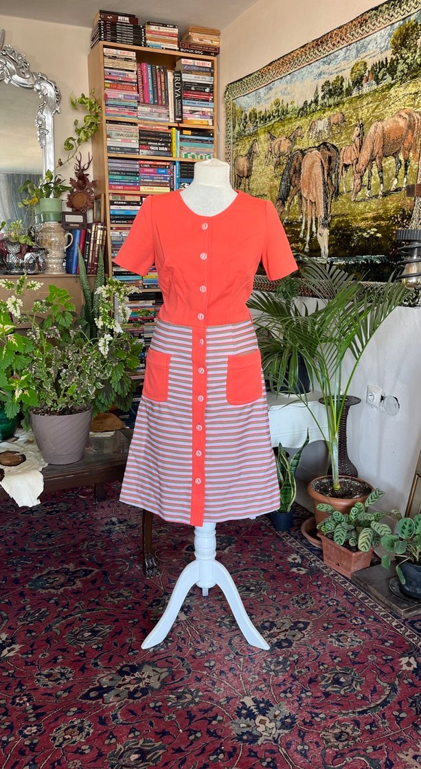 Kısa kollu, düğmeli ve kayık yaka bohem tarzda kadın elbisesi. baharlık kumaştan, cepli ve çizgili detaylı, günlük kullanıma uygun.
