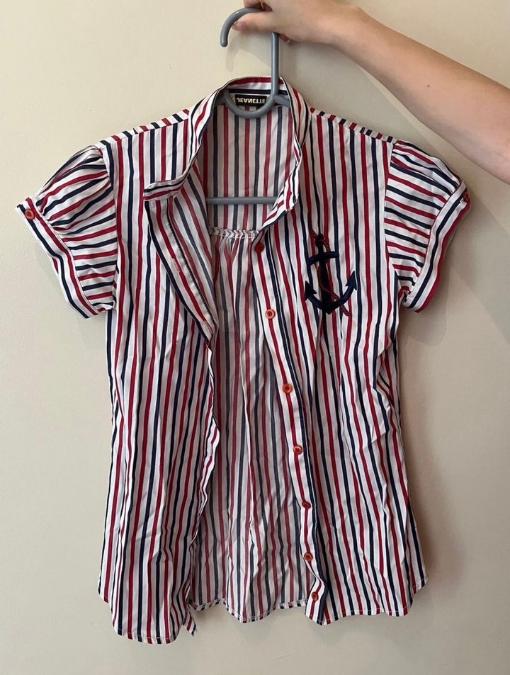 Kısa kollu, yakalı ve düğmeli, kırmızı-beyaz-mavi çizgili, parlak görünümlü, Paris tarzı, ofis ve günlük kullanım için uygun kadın gömleği.