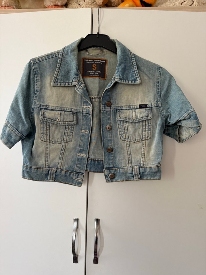 Bu dar kesim kadın kot ceket, kısa kollu, kesik yaka ve düğmeli kapamalıdır. Kısa boyda, gündelik sokak stili için uygundur.