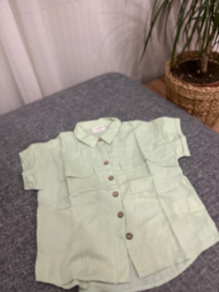 Keten kumaştan, düğmeli, kısa kollu ve yakalı, bol kesim bej gömlek. Günlük rahat sokak tarzı için uygundur.