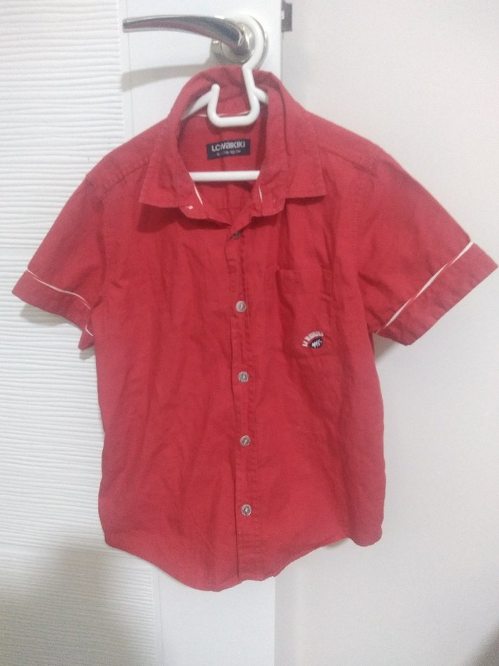 Pamuk kırmızı erkek cocuk gömlek, kısa kollu ve düğmeli. Yaka tipi klasik, beyaz şerit detaylı kollarda, bol kesim ve parlak renkli. Sokak stiline uygun.