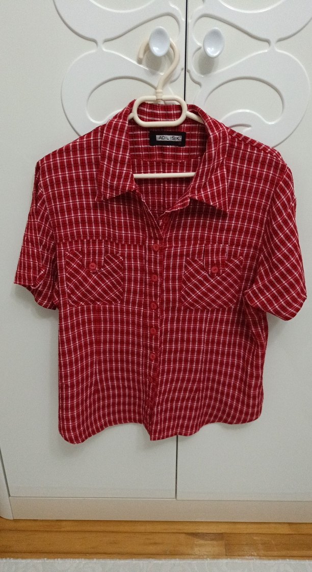 Kısa kollu, düğmeli ve yakalı kadın gömleği. İki göğüs cebi bulunur. Parlak sentetik kumaştan, rahat kesim ve günlük kullanım için uygundur.
