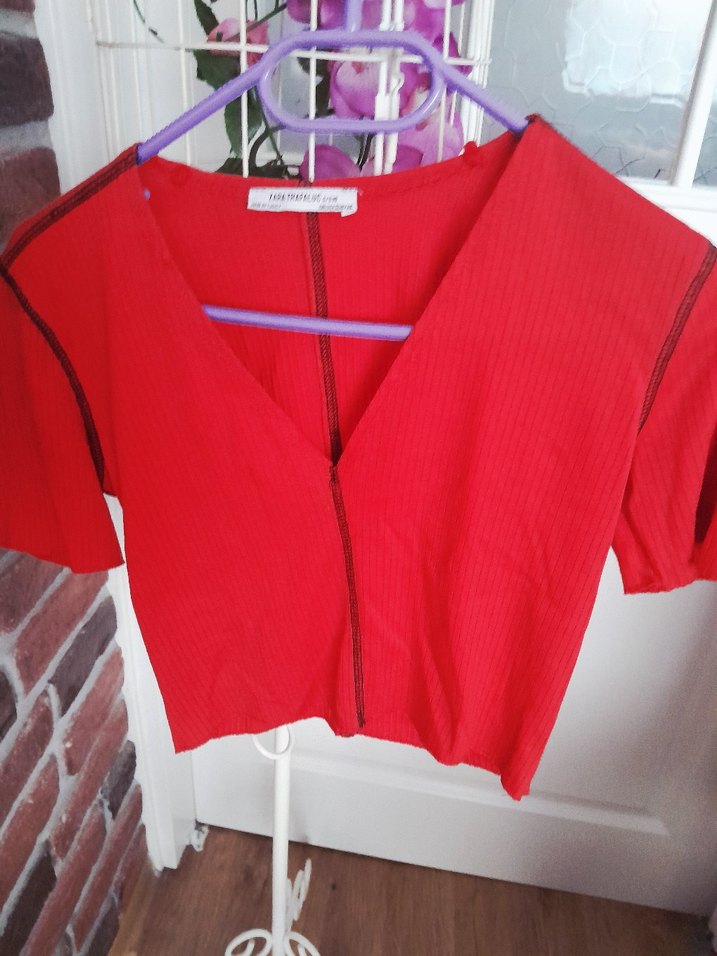 Kısa kollu, kırmızı v yaka, krop bluz. esnek penye kumaştan, sokak tarzı ve günlük kullanım için uygundur.
