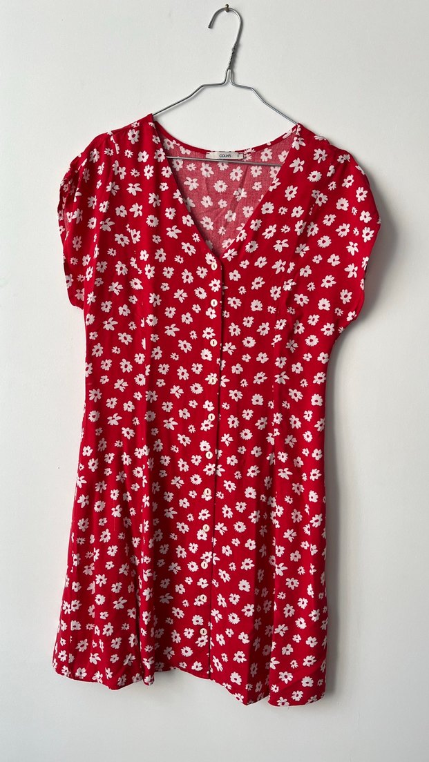 Kırmızı midi boy düğmeli elbise, V yaka ve kısa kollu. Bol kesim ve renkli çiçekli desenle bohem tarzda günlük kullanım için uygun. S/M bedene uygun