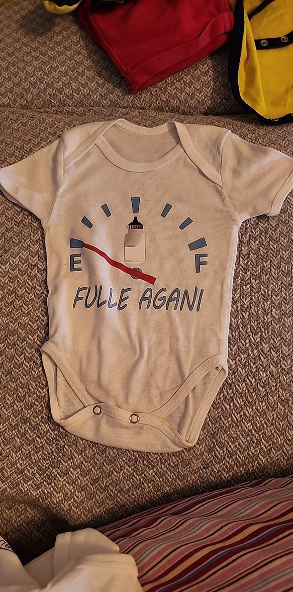 Beyaz, kısa kollu erkek bebek badi. Yakası yuvarlak ve yakıt göstergesi baskılı. Pamuklu, çıtçıtlı kapanışlı.