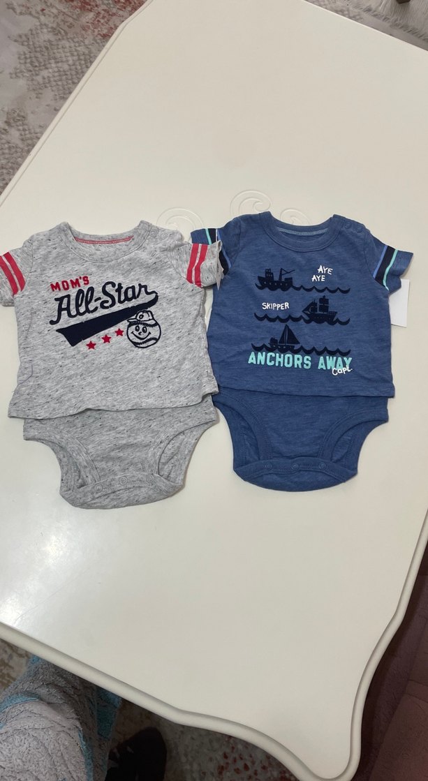 Gri ve mavi renklerde, kısa kollu, pamuklu, çıtçıtlı erkek bebek body seti. Gri body 'Mom's All-Star' baskılı, mavi body deniz temalı baskılara sahip. Sıfır ürün çok kullanışlı ⚓ yurt dışı ürünü kumaşı çok güzel ve rahat