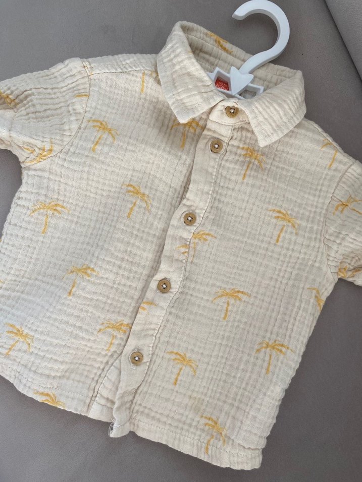 Yumuşak keten kumaştan yapılmış, düğmeli ve yakalı erkek gömlek. Kısa kollu ve bol kesim, pastel palmiyelerle casual tarzda. 1 kez kullanılabildi sorunsuz ve temizdir.