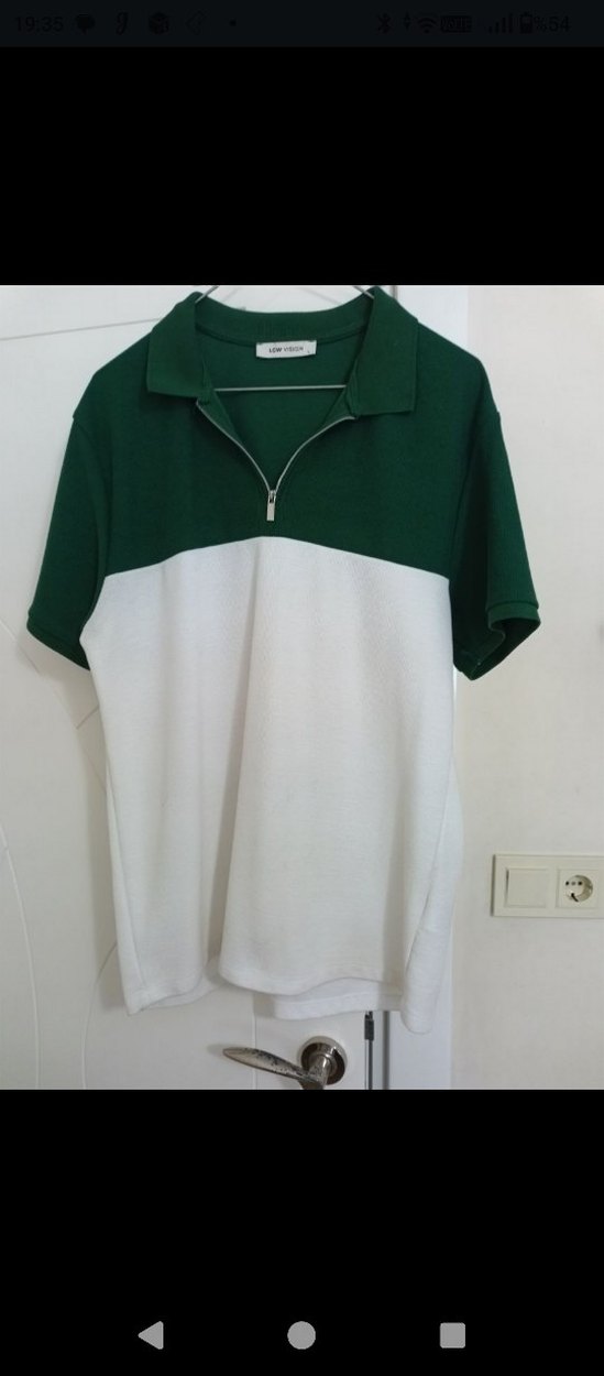 Kısa kollu, fermuarlı yakaya sahip erkek polo tişört. Hafif yeşil ve beyaz renklerde, bol kesim ve yumuşak, sıcak kumaştan üretilmiştir.