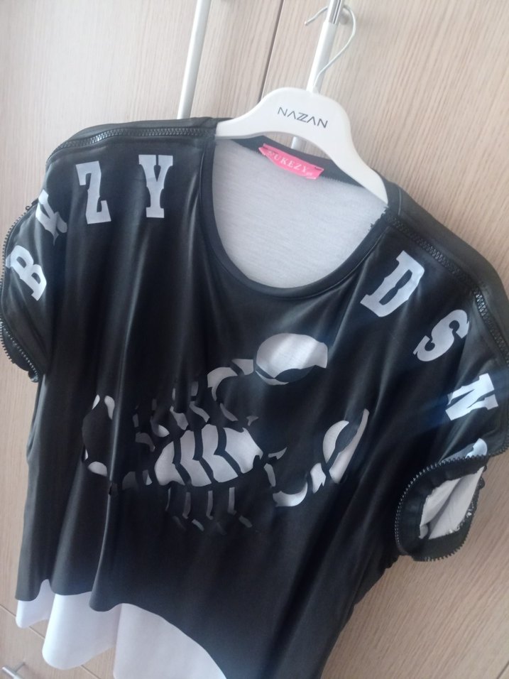 Siyah, kısa kollu, fermuarlı ve baskılı akrep desenli hamile tişörtü. Gevşek kesimi ve yuvarlak yakasıyla sokak stiline uygun.