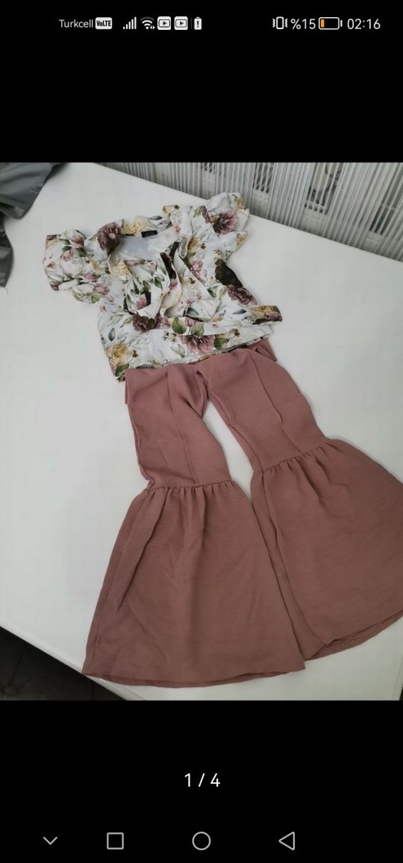 Kısa kollu, fırfırlı üst ve geniş paçalı, fırfır detaylı pantolondan oluşan bebek kız takımı.