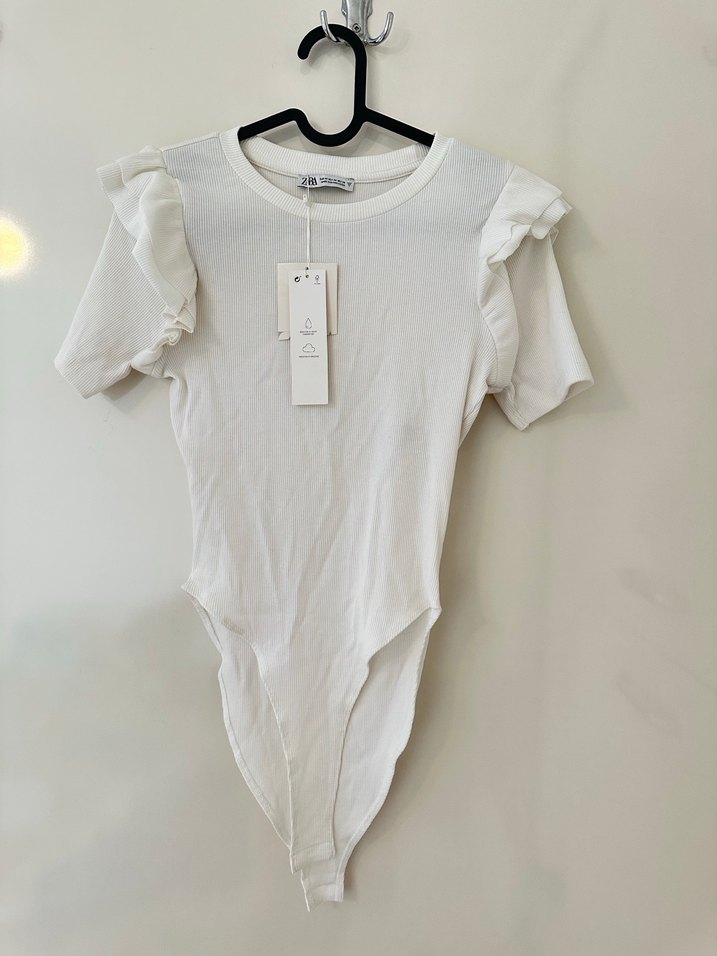 Kısa kollu, yuvarlak yakalı ve kollarında fırfır detayları bulunan beyaz kadın body.