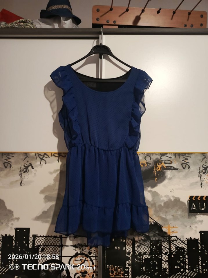 Koyu mavi renkte, fırfır detaylı ve yuvarlak yakalı, kolsuz mini elbisedir. Salaş kesimi ve desensiz yapısıyla gündelik kullanıma uygundur. ✨