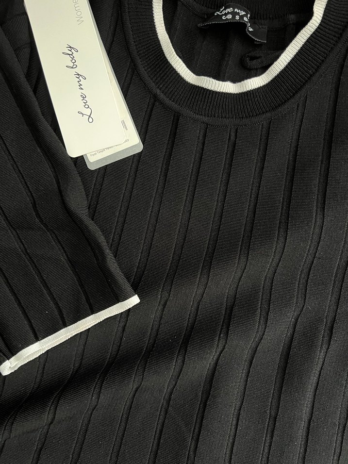 Siyah renkli, kısa kollu, fitilli örgü pamuklu kumaştan yapılmış kadın trikosudur. Minimalist tarzıyla günlük ve sokak modasına uygundur. Etiketi kopardım ancak kullanmadım