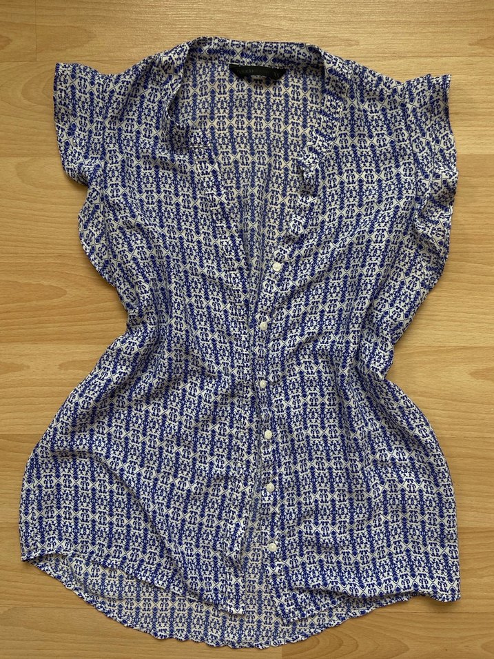 Mavi ve beyaz renklerde, desenli kısa kollu gömlek. Günlük kullanım için idealdir.