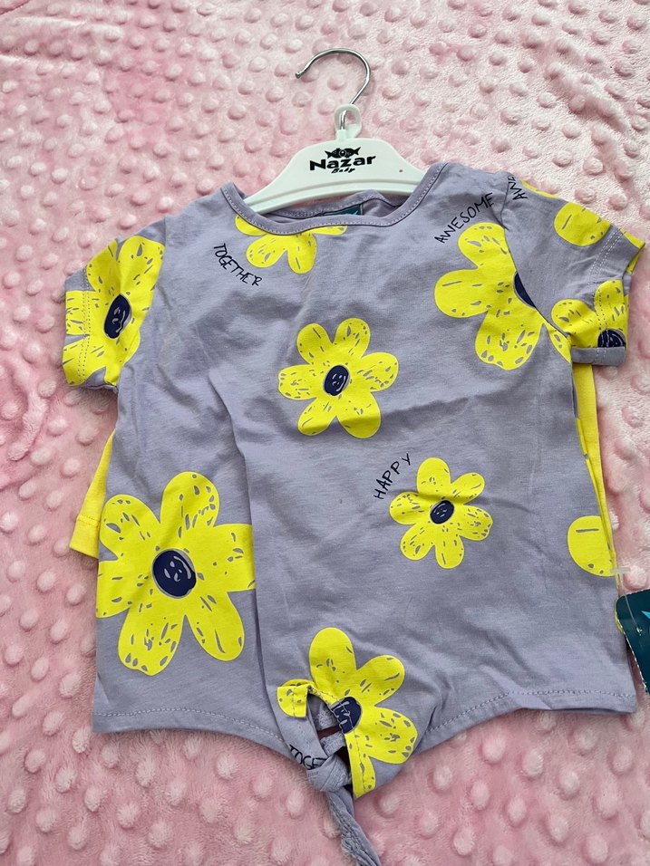 Kısa kollu, bisiklet yaka ve düğmeli gri bebek zıbını, sarı çiçek desenleriyle süslenmiştir. Sıfır etiketlidir