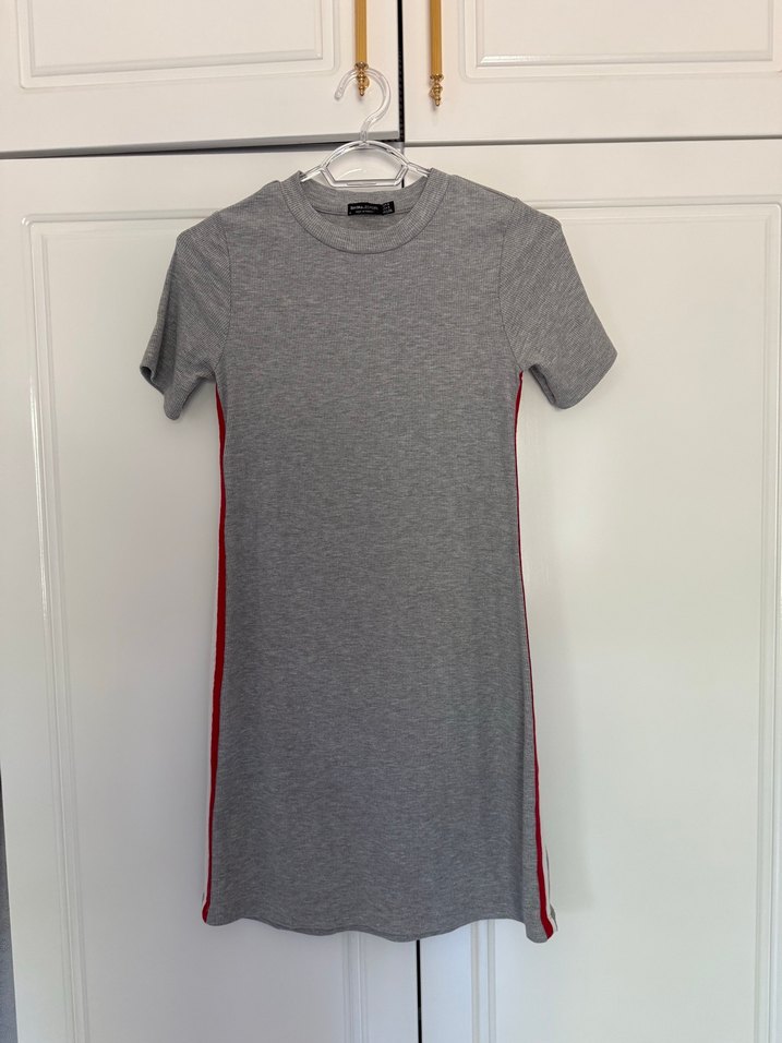 Kısa kollu, bisiklet yaka, gri renkli ve kırmızı yan çizgili, sentetik kumaştan üretilmiş, günlük kullanıma uygun, vücuda oturan midi elbise.
