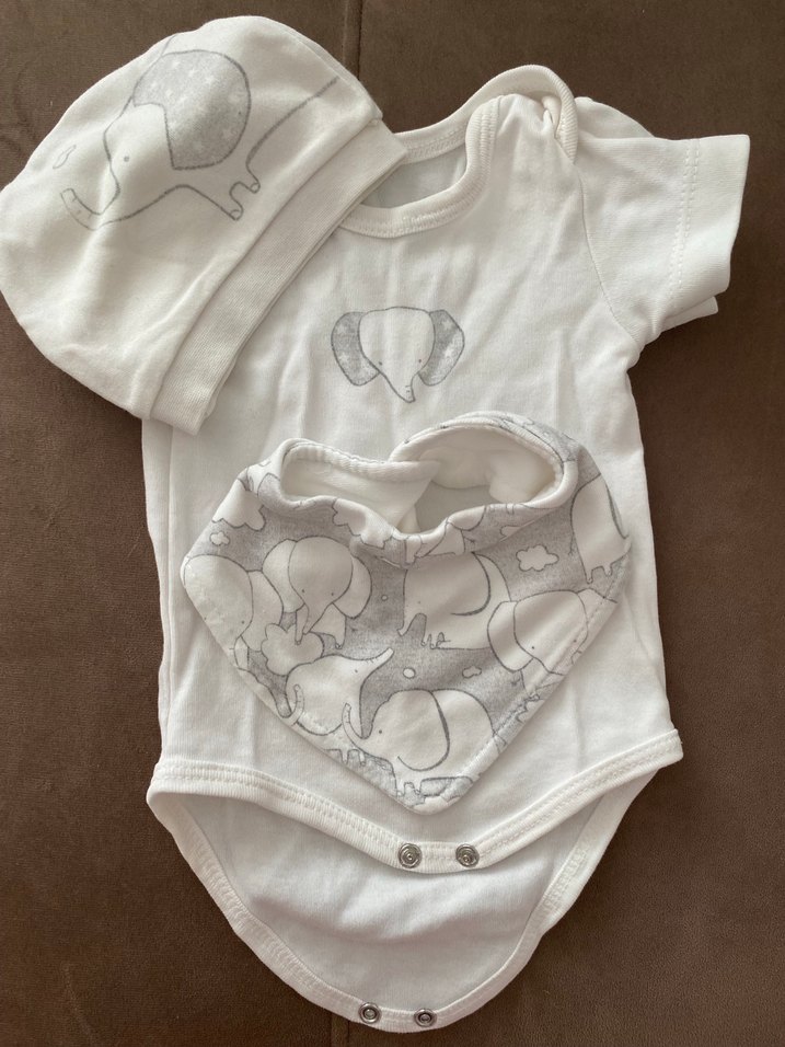 Kısa kollu pamuklu bodysuit, fil desenli gri önlük ve şapka içeren bebek hastane kıyafeti. Rahat ve şık.