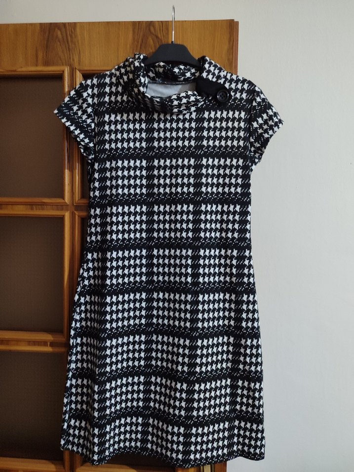 Düğmeli, yüksek yakalı, kısa kollu, gri kareli, vücuda oturan midi elbise, günlük sokak stili için uygundur. Boy 81 cm
