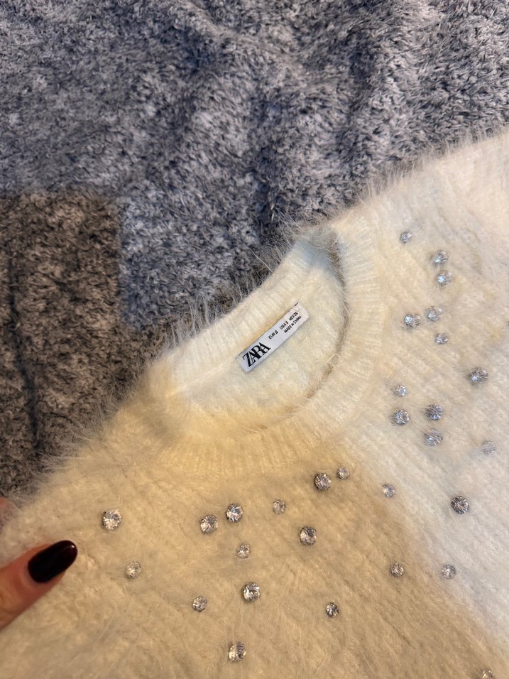Kısa boy, bol kesim triko kazak, yuvarlak yaka ve kısa kollu, nakışlı detaylar ve yumuşak kürk süslemeleriyle rahat bir sokak stili sunar.