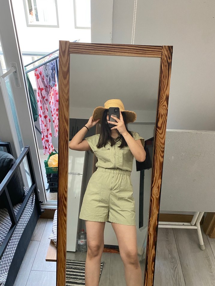 Haki renk kısa kollu, mini tulum, sentetik kumaştan üretilmiş. Minimalist ve rahat şıklık sunar, gündelik sokak stili için uygun.