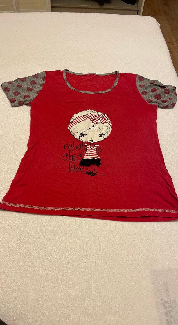 Kırmızı, kısa kollu hamile tişörtü, gri puantiyeli kollu ve dantel detaylıdır. Gevşek kesim, baskılı çizgi karakterli, günlük kullanım için uygundur.