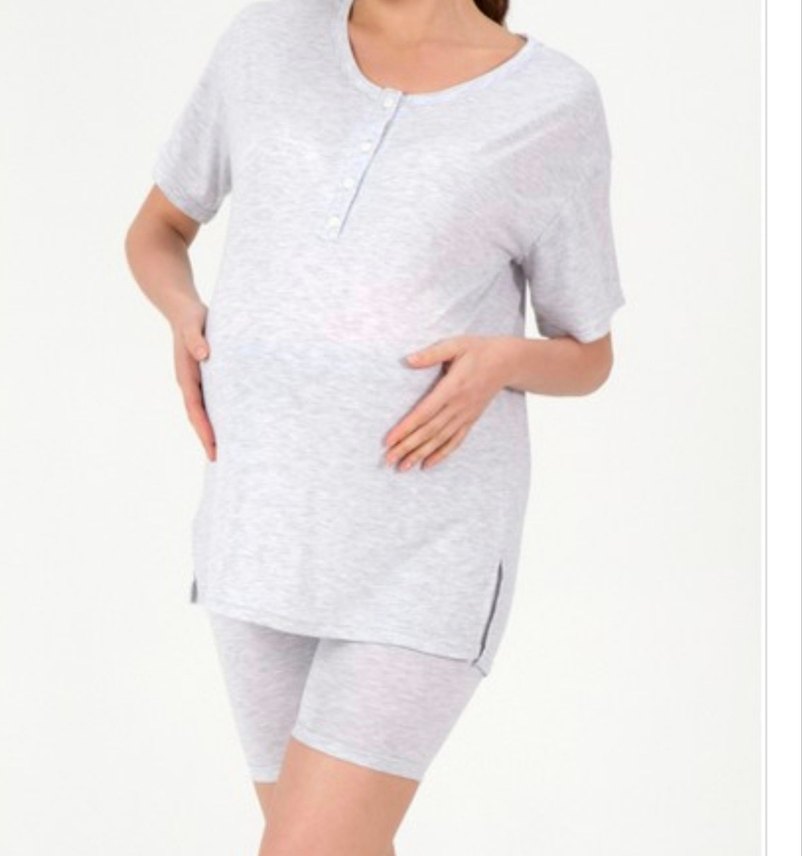 Gri renkte, kısa kollu, yuvarlak yakalı, düğmeli kısa üst ve şortlardan oluşan bol kesim hamile ve emzirme pijama takımı. Rahat ve yumuşak kumaştan.