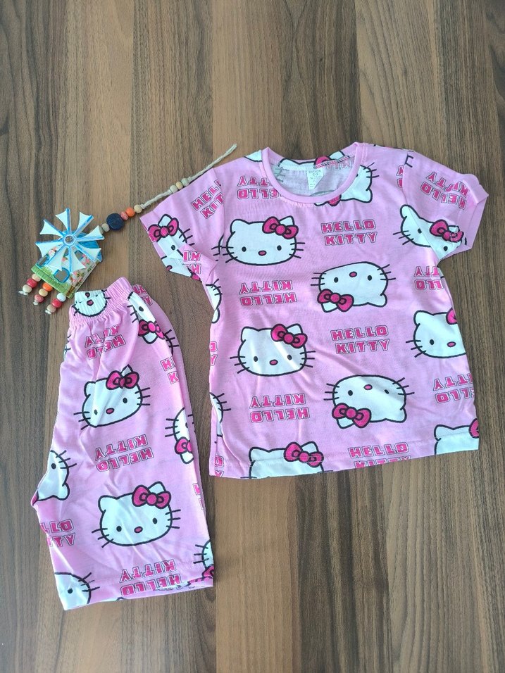Renkli, kısa kollu üst ve şorttan oluşan bebek kız takımı. Pembe zemin üzerine örme, baskılı Hello Kitty deseni bulunur.