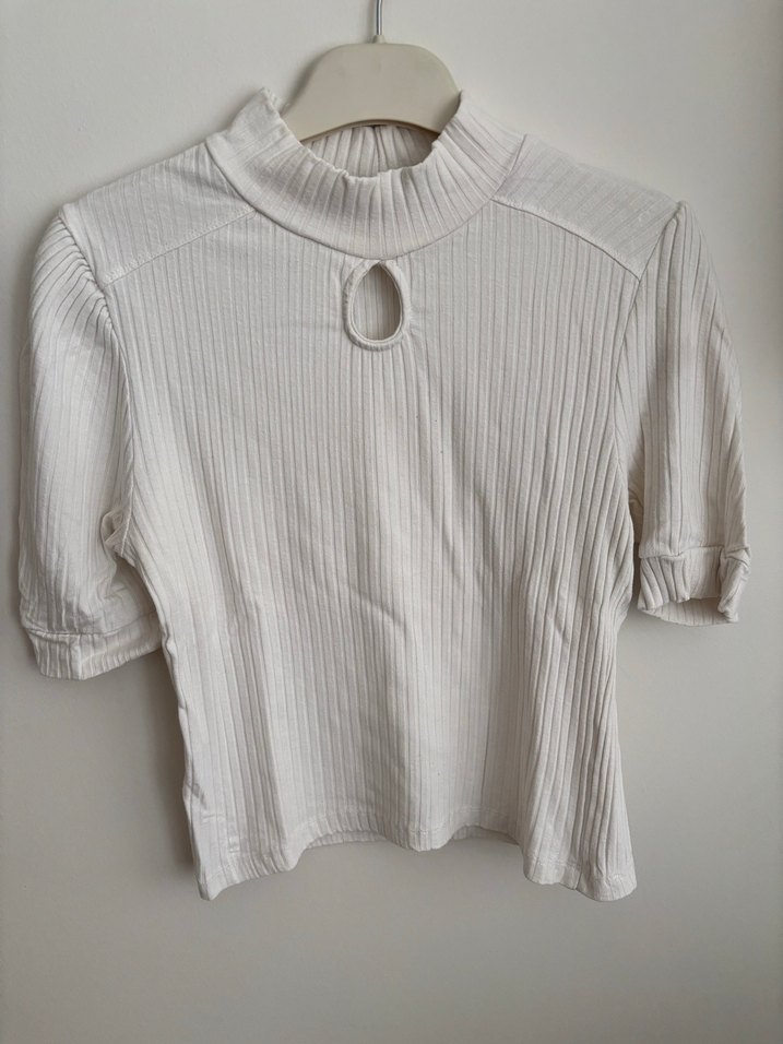 Beyaz kısa kollu ve kısa kesim, dar kesim bluz.