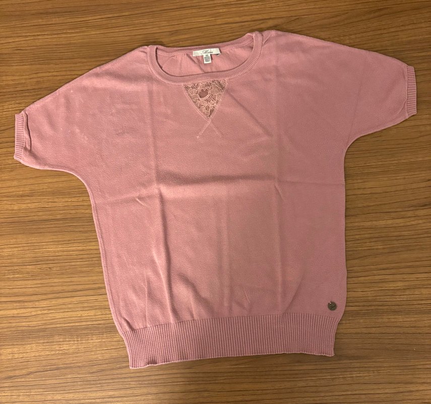 Pembe renk, kısa kollu, yuvarlak yakalı, dantel detaylı örgü kadın kazak. Rahat ve günlük kullanım için uygundur. Az kullanılmıştır, hiçbir sorunu yoktur. Rengi ilk fotodaki gibidir.