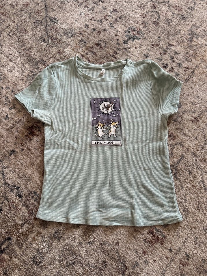 Pamuklu, baskılı ve kısa kollu bu tişört. Boy 50 cm. En 36cm. Xl yazıyor sanırım çocuk reyonundan almışım. Ben 58 kiloyum S giyiyorum ben kot üstüne kullandım. Artık giymediğim için satıyorum bir sıkıntısı yok
